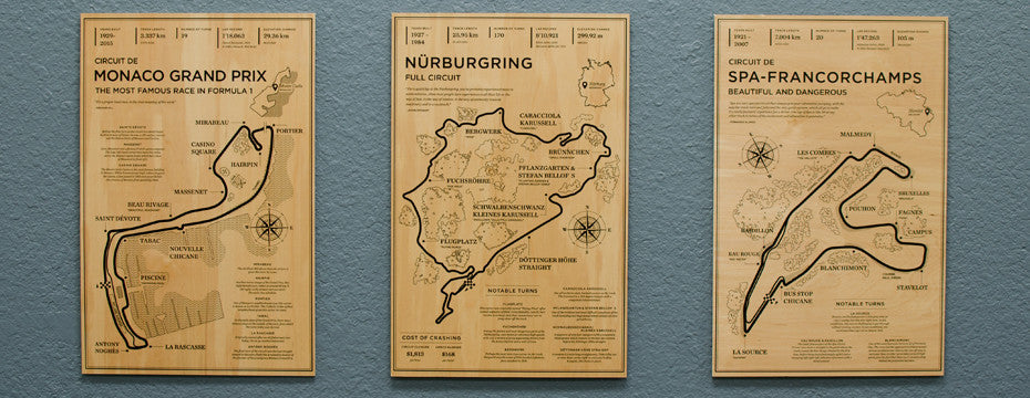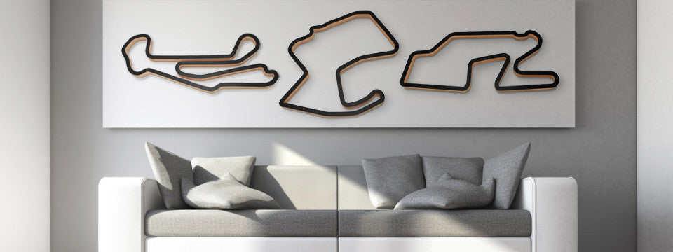 Shop over 650 beautifully crafted wooden sculptures of race tracks and road courses from around the world. These pieces of art are precision CNC routed from 26 laminated sheets of beautiful Baltic Birch and are covered with assorted toppings ranging from laminates to carbon fiber. Uniform line-widths among all our race track sculptures ensures a consistent look in your home or office.